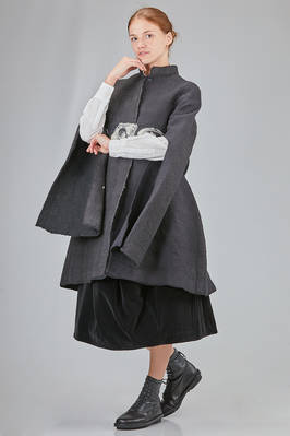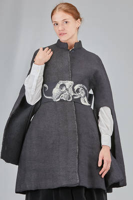 over the knee 'sculpture' coat in wool and silk nuno-felt with handwriting, embroidery and needlefelting technique, single breasted, band collar, closure with snap buttons and a band with floral motif, sleeves open on the inside, folder central back with contrasting color motif, leaf drawn on one sleeve, lean and flared line. It is a unique garment, entirely handmade, with organic and sustainable fibers