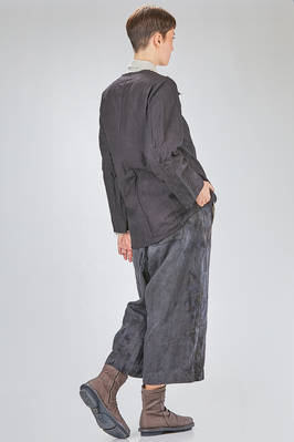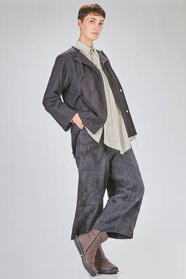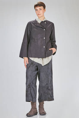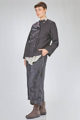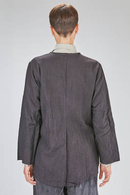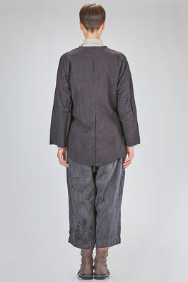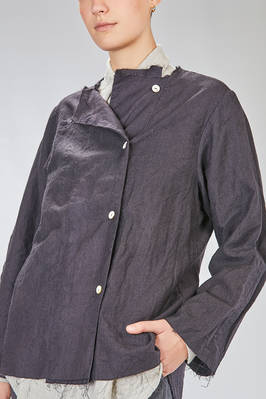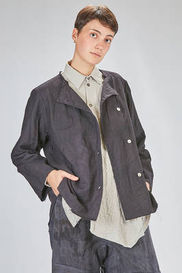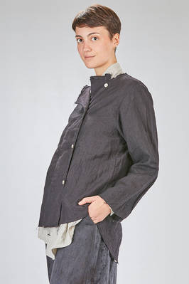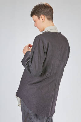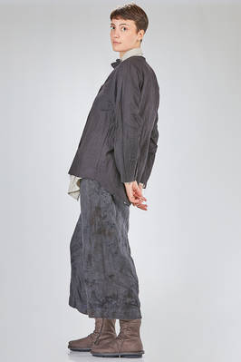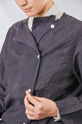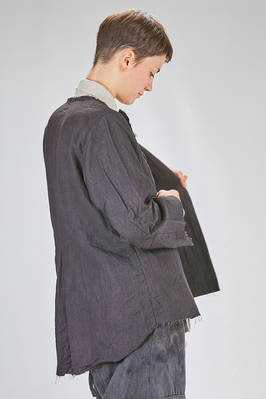 long and wide jacket/shirt in lightweight washed wool canvas with raw-cut edges, double-breasted, crew neck, closure with horn buttons, rounded and longer hem at the back. The model is 180 cm tall and wears size I