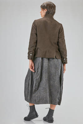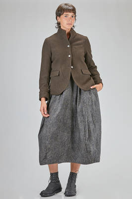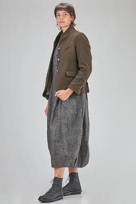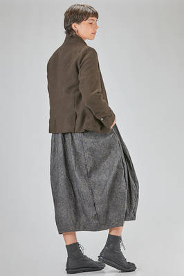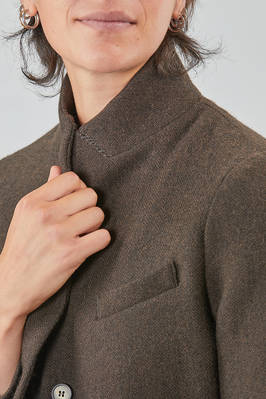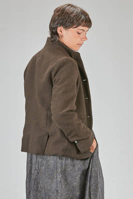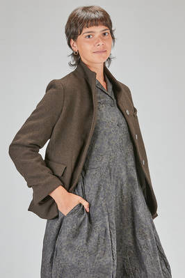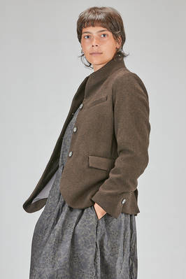 short and slim jacket, in Tyrolean wool shetland, lined in cotton canvas, one chest with revers and band collar, closure with buttons, pockets with flaps at the bottom, cuffs with buttons and folds with 'crumpled' effect, two rear slits with 'taken up fabric' effect. The model is 178 cm. tall and she is wearing the size 42