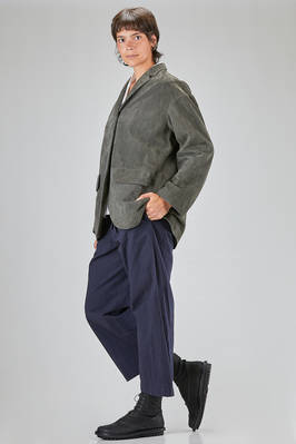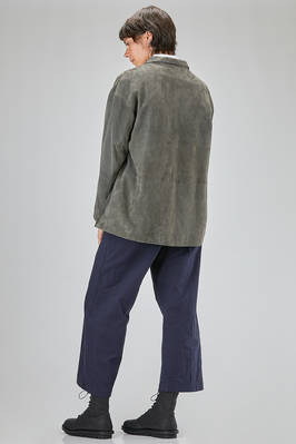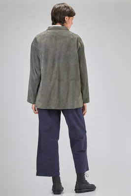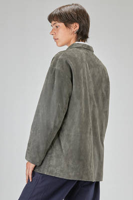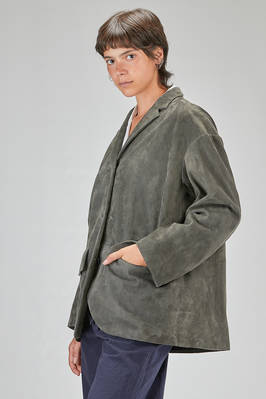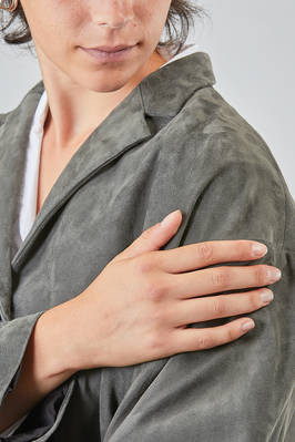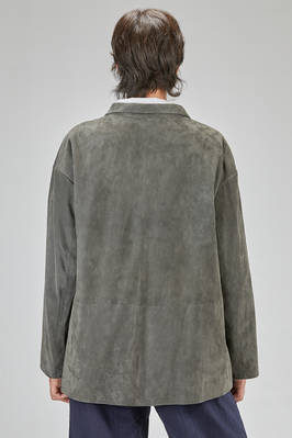 hip-lenght jacket, wide, in soft suede, lined in cotton canvas, one chest with revers, closure with buttons, pockets with flaps on the front. The model is 178 cm. tall and she is wearing the size 42