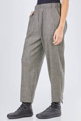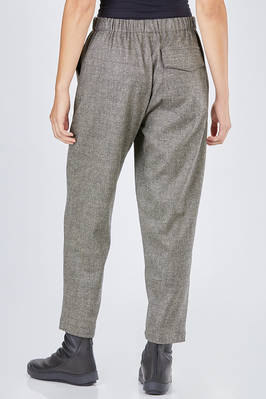 soft trousers in light pepper and salt new wool, cashmere and elastane tweed, elastic waistband, diagonal welt pockets on the sides and one pocket with flap on the back. The model is 178 cm. tall and she is wearing a size I
