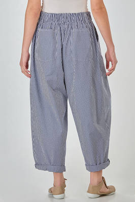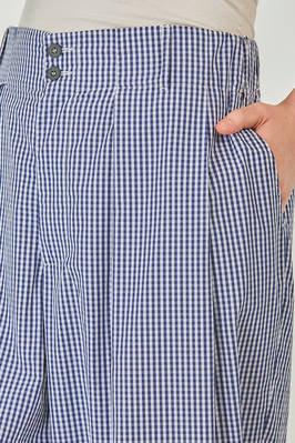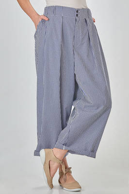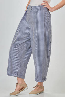 wide pants in light-weight vichy cotton, front darts, zip and button closure, elastic at the back of the waistband, belt loops, vertical side welt pockets, two patch pockets at the back. The model is 180 cm. tall and wears a size I