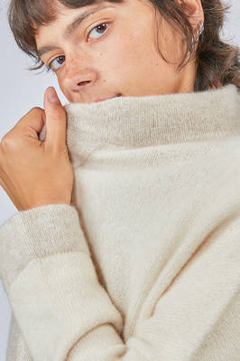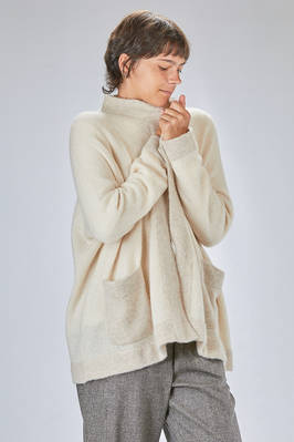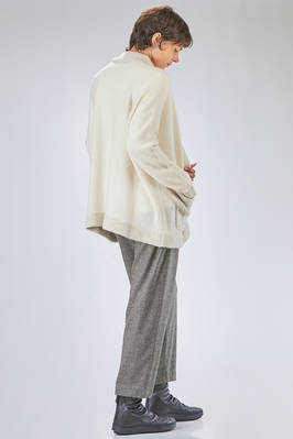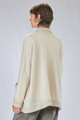long and straight cardigan in soft hand-knitted cashmere and silk yarn with profiles and pockets in a slightly different touch of color, band collar, two pockets applied at the bottom, closure with magnetic button. The model is 178 cm. tall and she is wearing a size I