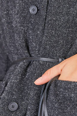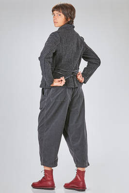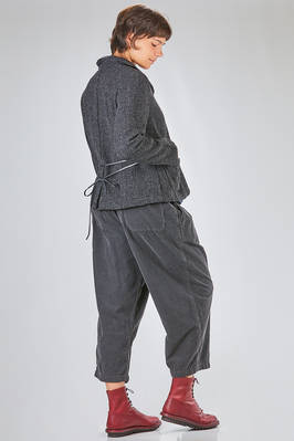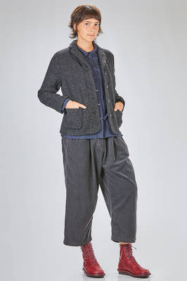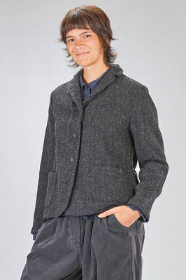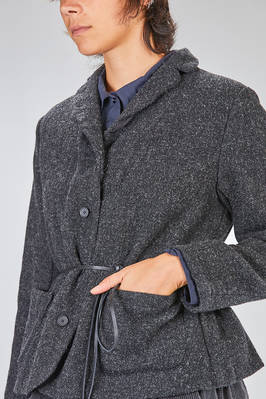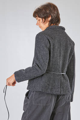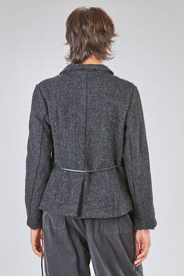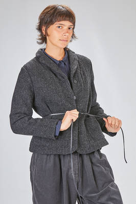 hip-length jacket, soft, in wool tweed, single-breasted with small lapels, small patch pockets at the bottom, closure with buttons and a small leather lace, small central back vent. The model is 178 cm tall and wears size I