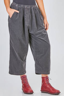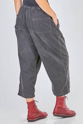 wide trousers, in washed cotton vertical wale corduroy, elastic waistband and slight gathering, vertical welt pockets on the sides, two patch pockets on the back. The model is 178 cm tall and wears size I