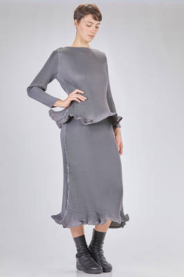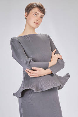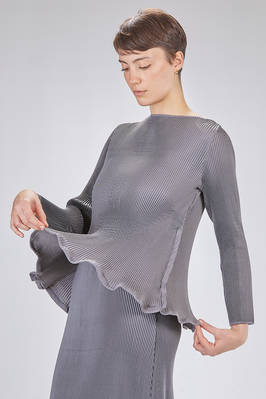 hip-length 'sculpture' top, fitted line, in vertically pleated polyester plissé, boat neck, long sleeves, fully moldable hem with an all-over wavy metallic core. The model is 180 cm tall and wears size M