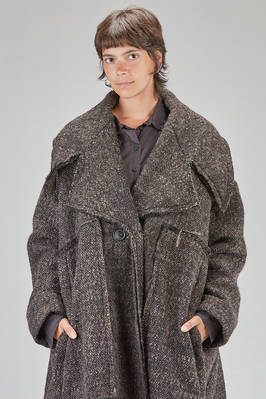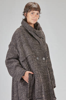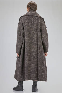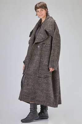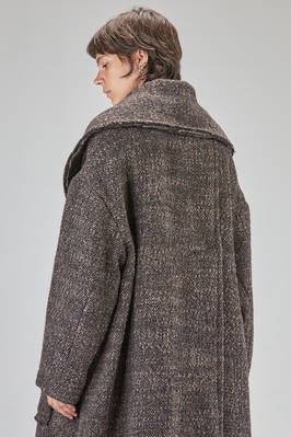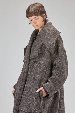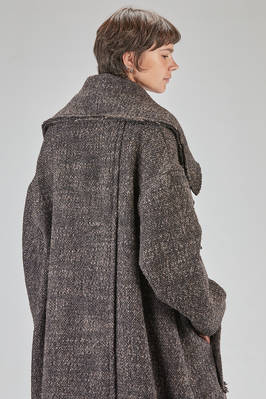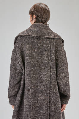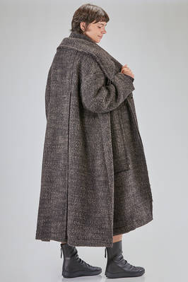 long and oversize coat, in pepper and salt wool, acrylic, polyamide and polyester bouclé, double chest with big raw cut revers, closure with buttons, two big pockets applied on the front with vertical flush opening on the sides, high lateral slit on the back. The model is 178 cm. tall and she is wearing the size S