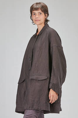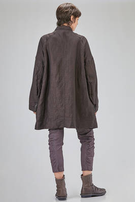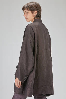 oversize overcoat-caban, knee length, in washed and melange linen, cotton and wool gauze, lined in polyester and cotton canvas, one chest, shirt collar, with revers, two pockets with flaps on the front, cuffs with buttons, lateral slits. The model is 178 cm. tall and she is wearing the size S