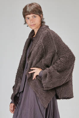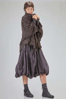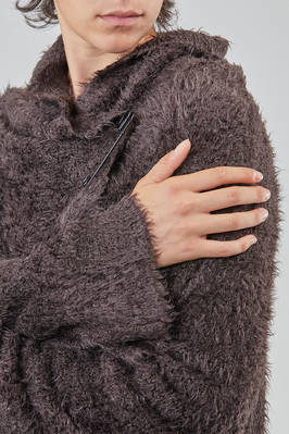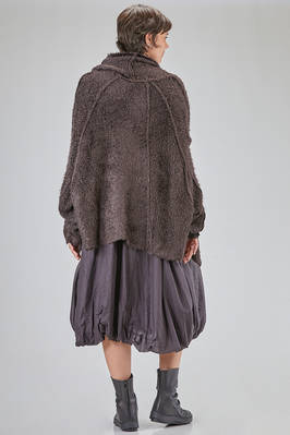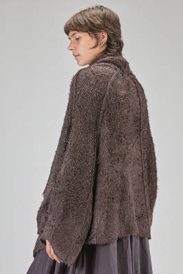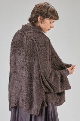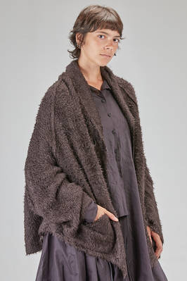long and oversize cardigan, in soft long filament silk knit, shawled collar, dropped long sleeves wide at the cuffs, closure with safety pin, external crossed diagonal seams, two pockets at the bottom, diagonal and asymmetric bottom. The model is 178 cm. tall and she is wearing the size S