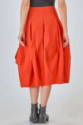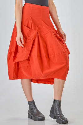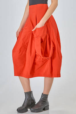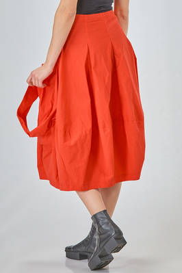 under-the-knee skirt, tulip shape, in lightweight crêpe with a texture made of vertical viscous,polyamide, cotton, linen and elastan waves, high waist, slim fit on the hips, big pockets applied and straps, side vertical jetted pockets. The model is 170 cm high and wears a size S
