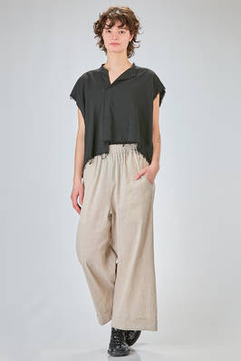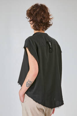 short shirt, wide and asymmetrical in washed cotton muslin with raw cut edges, band collar with v opening, asymmetrical bottom shorter on one side and round on the back. The model is 170 cm high and wears a size I