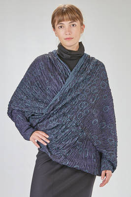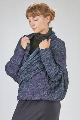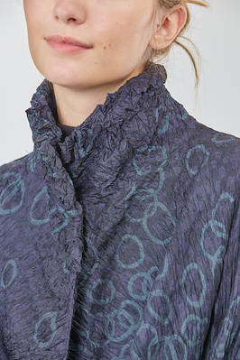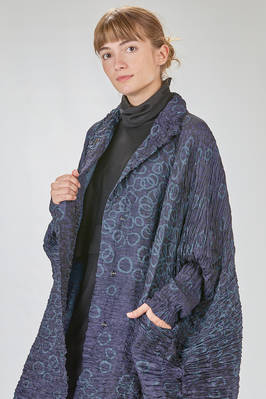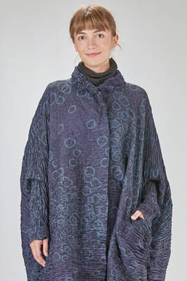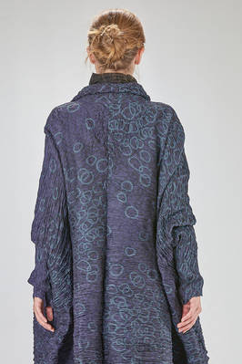 under the knee overcoat, wide, in horizontal polyester froissé with irregular and overlapped circles motif, one chest, shirt collar, closure with pressure buttons, dropped sleeves lean at the cuffs, two pockets applied on the front. The model is 167 cm. tall and she is wearing the French size 38