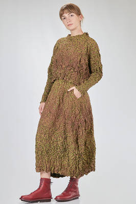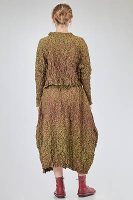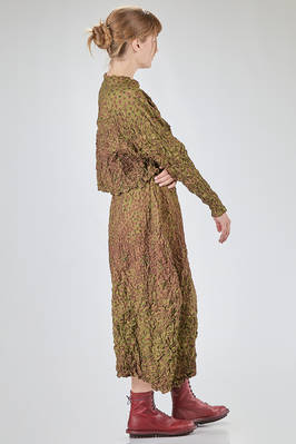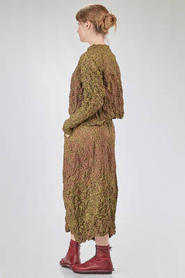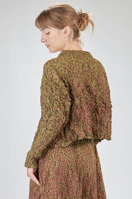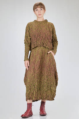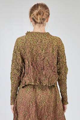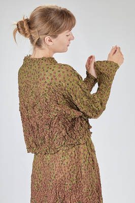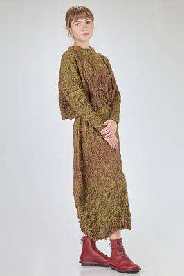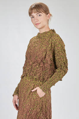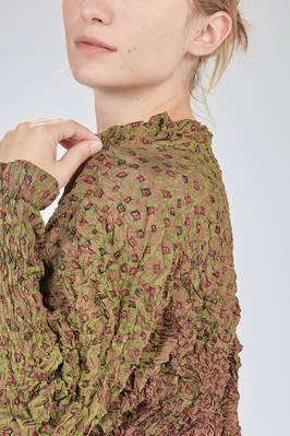 short and wide top in crinkled polyester froissé, with an irregular circular shibori pattern in various sizes and colors, rising round-neck with little diagonal slit on one side, dropped long sleeves lean at the cuffs, rounded bottom longer on the sides. The model is 167 cm. tall and she is wearing the French size 38