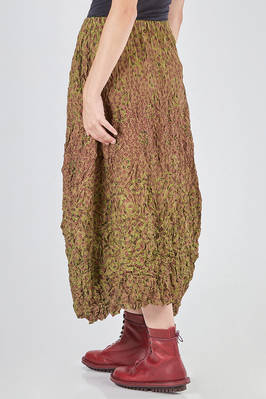 longuette skirt, wide, in crinkled polyester froissé, with an irregular circular shibori pattern in various sizes and color, elastic waistband, vertical welt pockets on the sides, tulip line. The model is 167 cm. tall and she is wearing the French size 38