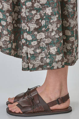 soft cowhide leather sandal with an overlapping flap layered over a moose leather flap, secured with braided laces tied over the instep, fastened with a fabric strap and a side buckle, low, rounded rubber sole. Model created in collaboration between Trippen and the Stuttgart based brand Pal Offner