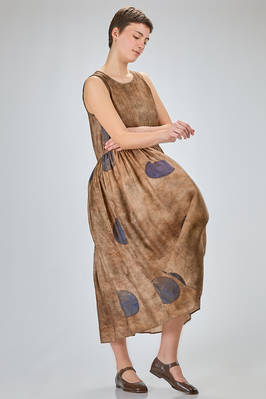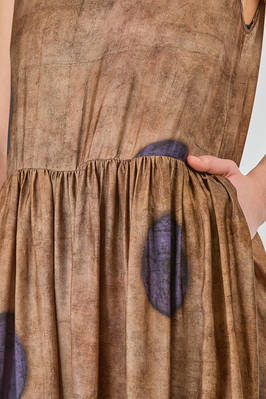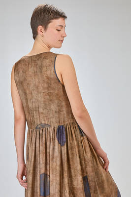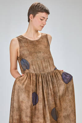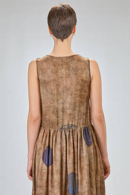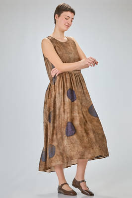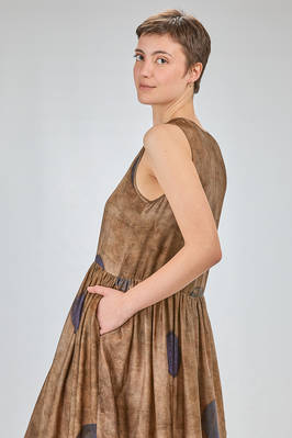 longuette dress, wide, of viscose and cupro twill with big blended pois on a blended base, wide crew neck, sleeveless, cut and curled on the belt, vertical side jetted pockets. The model is 180 cm high and wears a size M