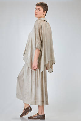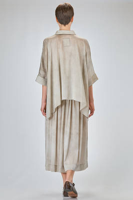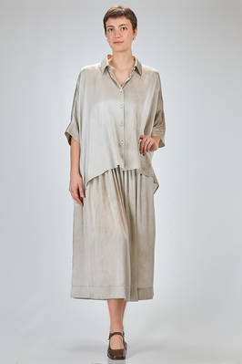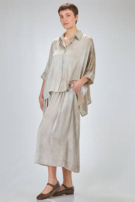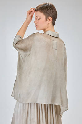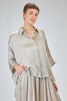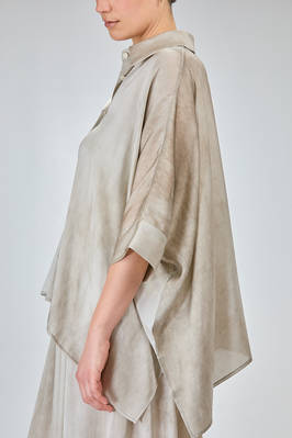long and wide shirt of silk and elastan crêpe de chine, shirt style collar, closure with buttons, drop short sleeve with band on the edge, side small vents, bottom longer on the sides. The model is 180 cm high and wears asize M
