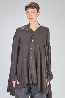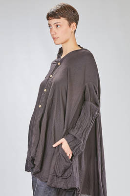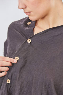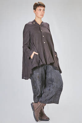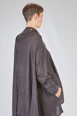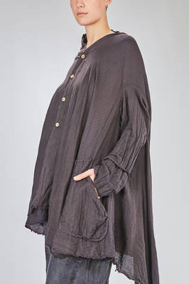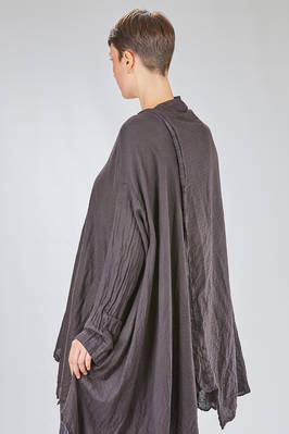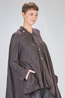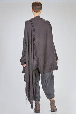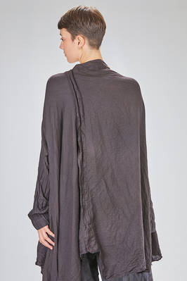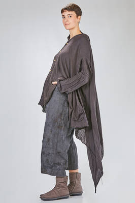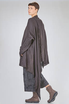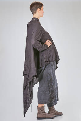 giacca/camicia lunga, ampia e asimmetrica in chevron leggero e morbidissimo di cachemire e seta, un petto, scollo a v, chiusura con bottoni in legno di ulivo, due tasche applicate sul davanti, piega diagonale sul retro con lungo pannello sistemabile a piacere sul corpo, fondo con lunghezze irregolari tutto tagliato a vivo. La modella è alta cm. 180 e indossa la taglia I