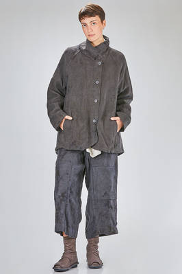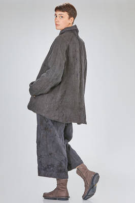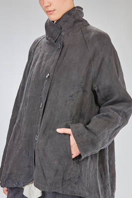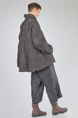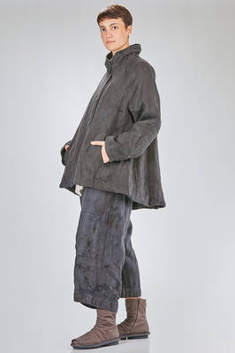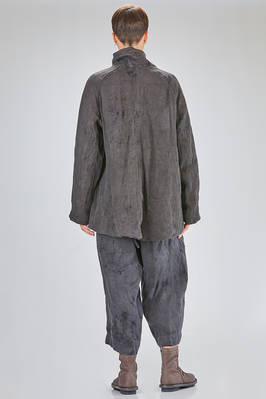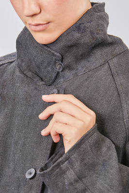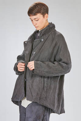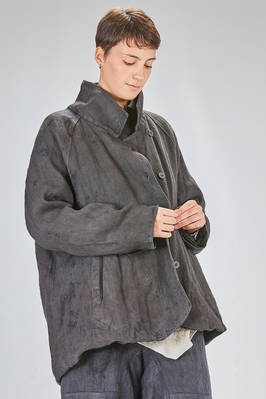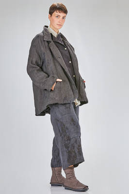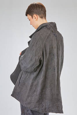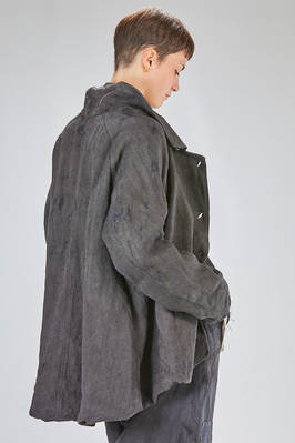 caban over in canvas rustico di canapa tinto a mano con ombre ad effetto macchie di inchiostro, foderato in tela di cotone, un petto, collo a camicia stondato, spalla raglan, chiusura con bottoni, tasche a filo diagonali sul davanti, fondo stondato più lungo sul retro. La modella è alta cm. 180 e indossa la taglia I