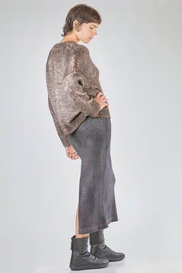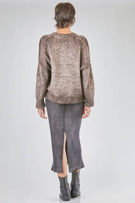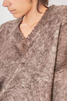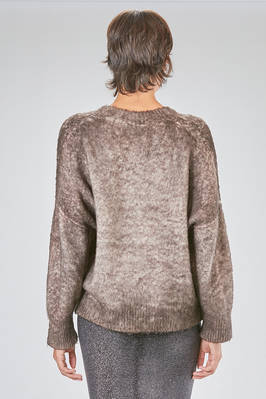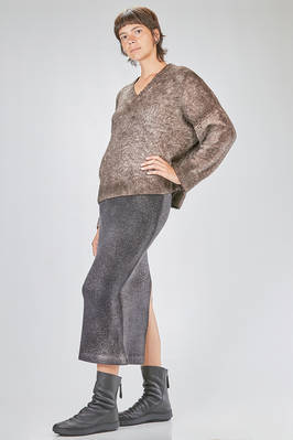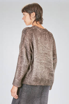 maglia al fianco, morbida, in maglia ad ovatta morbidissima di cotone, poliammide ed elastan sovratinta a mano e e tutta sfumata, scollo a v con profilo con costine, manica lunga scesa con costine ai polsi, fondo a costine. La modella è alta cm. 178 e indossa la taglia S