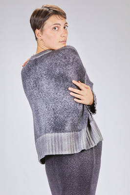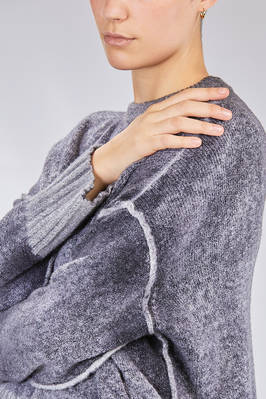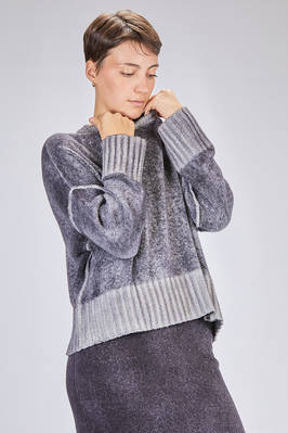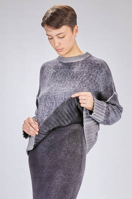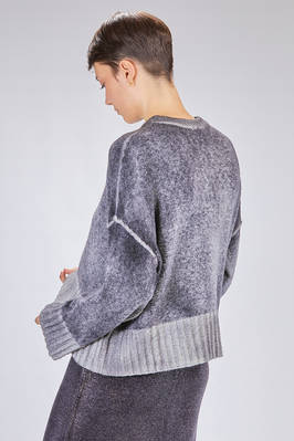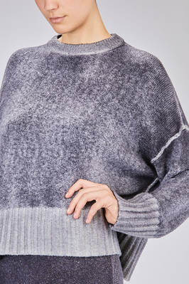 maglia al fianco, ampia, in maglia sovratinta e tutta sfumata di lana merino extra fine, cachemire e seta con cuciture in contrasto di colore, girocollo a costine, manica lunga scesa con polsini a costine, alto fondo a costine. La modella è alta cm. 180 e indossa la taglia S