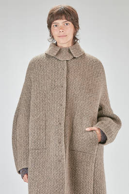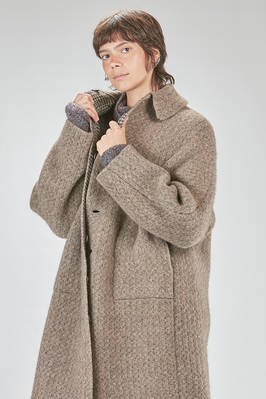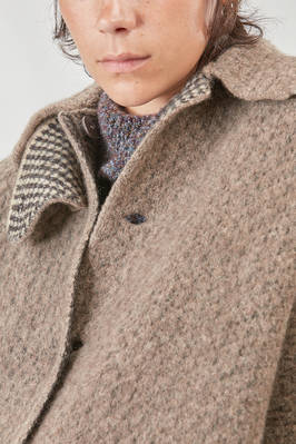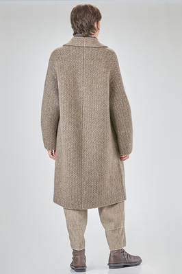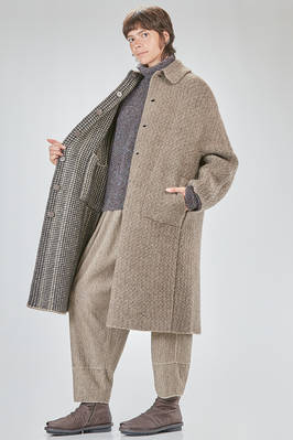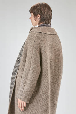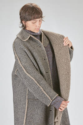 cappotto sotto al ginocchio, ampio, in maglia double di lana, poliestere, yak, mohair ed elastan, da un lato lavorata ad effetto shetland melange, dall'altro a piccoli check bicolori e melange, un petto, collo a camicia con pattina che si può sormontare e chiudere bottoni, chiusura con bottoni a scomparsa, tasche a filo orizzontali ai lati e applicate all'interno, reversibile. La modella è alta cm 178 e indossa la taglia S