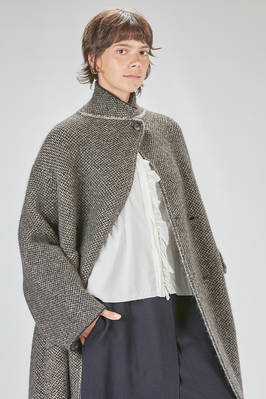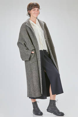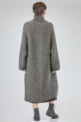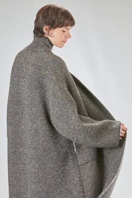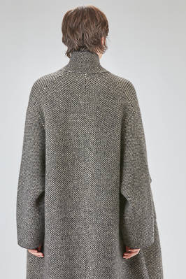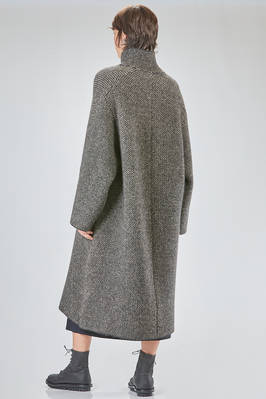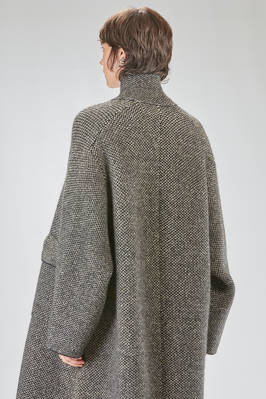 cappotto lungo e ampio in maglia double micro-spinata di lana, poliammide, yak, mohair ed elastan, doppio petto, chiusura con bottoni a scomparsa, collo a camicia con bottone laterale, tasche a filo verticali a lati con pattina nella parte superiore. La modella è alta cm 178 e indossa la taglia S