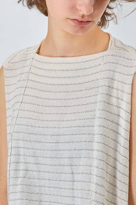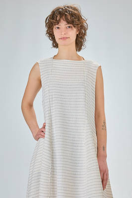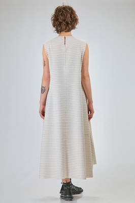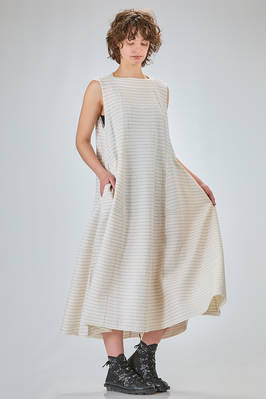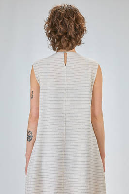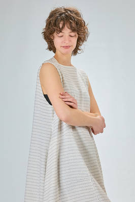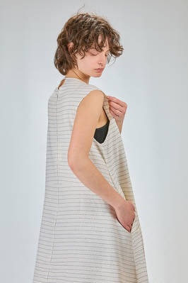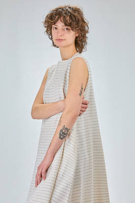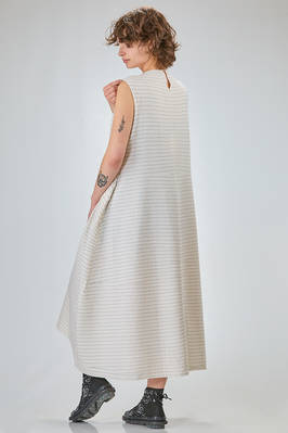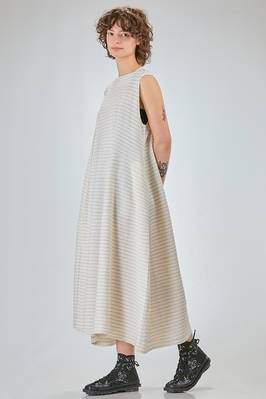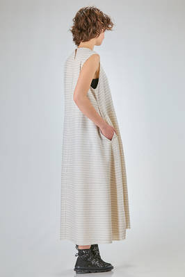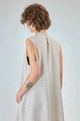 abito longuette, linea morbida e sfiancata, in maglia leggera di seta, lino e cotone con righina sottile orizzontale a tratteggio, scollo a barchetta e a v sul retro con bottoncino, senza maniche, tasche a filo verticali ai lati. La modella è alta cm 170 e indossa la taglia S
