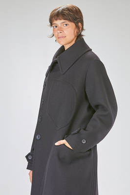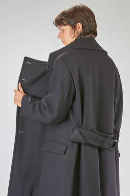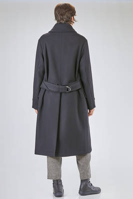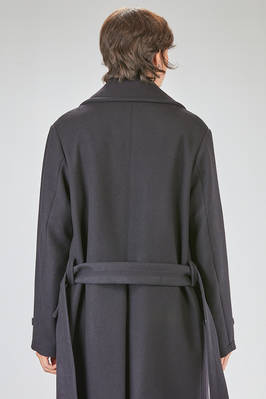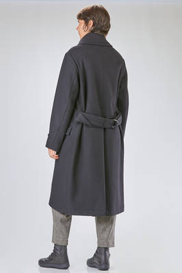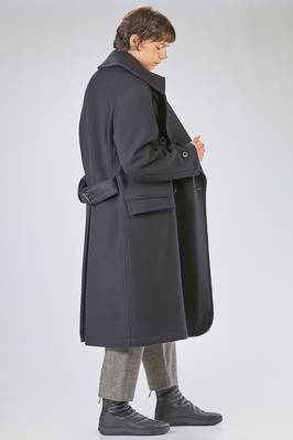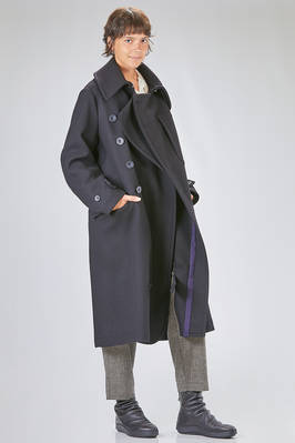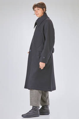 cappotto a trench lungo in panno di lana, poliammide e cachemire, doppio petto con ampi rever e grande collo a camicia montante, chiusura con bottoni e gancetto metallico al collo, martingala removibile e regolabile, una grande tasca applicata al petto, tasche con pattina sul davanti. La modella è alta cm 178 e indossa la taglia I