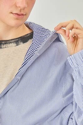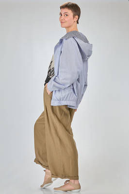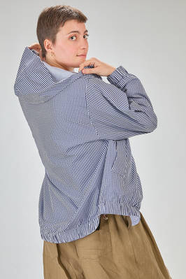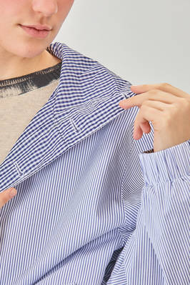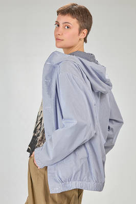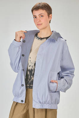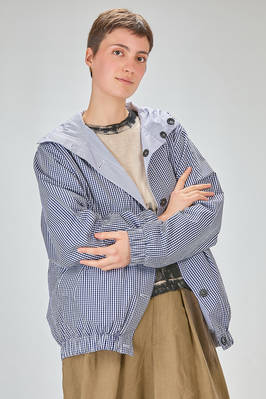 blouson lungo e ampio in tela doppiata di cotone: un lato a bastoncini verticali e un lato in vichy, un petto con cappuccio, chiusura con bottoni in contrasto di colore, fondo manica con elastico, tasche a filo verticali sul davanti, fondo con elastico, reversibile. La modella è alta cm. 180 e indossa la taglia I