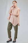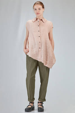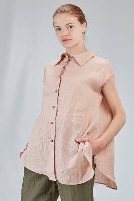 camicia lunga, ampia e asimmetrica in tela fiammata di lino lavato, colletto doppiato con rever piegato a origami, chiusura con bottoni, senza maniche, fondo diagonale, lievemente stondato, più corto sul retro