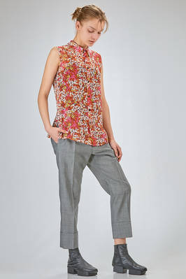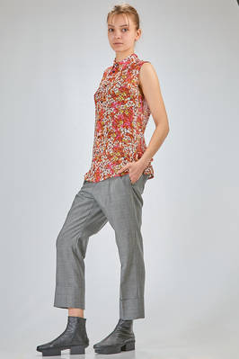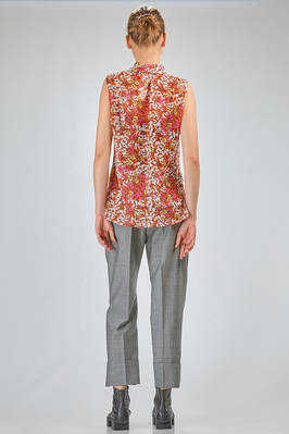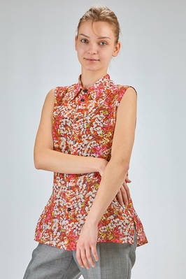 camicia al fianco, sfiancata, in chiffon di seta con stampa floreale astratta, collo a camicia, senza maniche, chiusura con bottoni. La modella è alta cm. 175 e indossa una taglia italiana 40