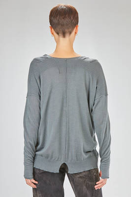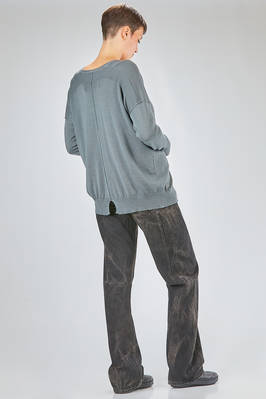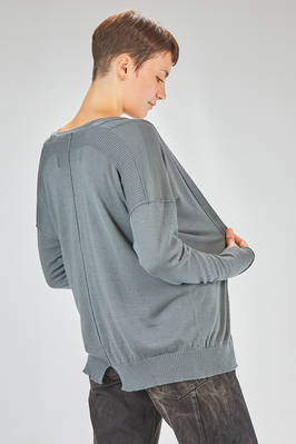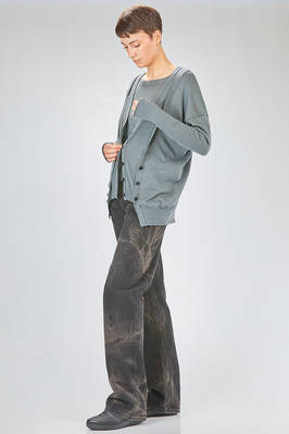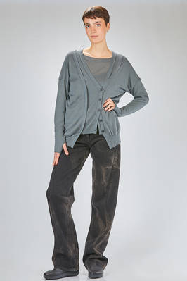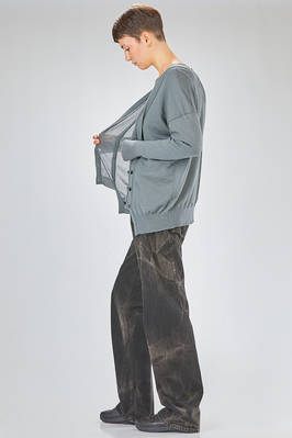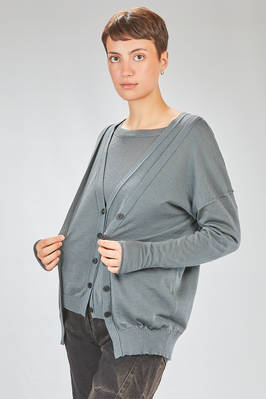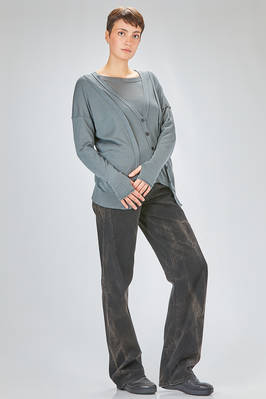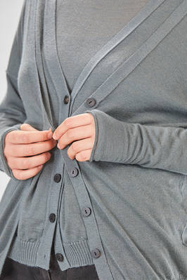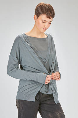 cardigan lungo e ampio in maglia rasata leggera di cachemire e seta, scollo a v sul davanti e a v squadrata sul retro, chiusura con bottoni, costruito a cardigan lungo aperto su cardigan chiuso più corto e cucito ai lati, fondo manica con asola per il pollice, fondo più lungo nella parte posteriore con spacchetto centrale. La modella è alta cm 180 e indossa la taglia S