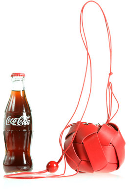 piccola borsa sferica a tracolla in fasce di pelle intrecciate, chiusura a coulisse con cordoncino e anelli in metallo, tracolla in cordoncino con perla in tinta, foderata; diametro 13cm, tracolla 140cm
