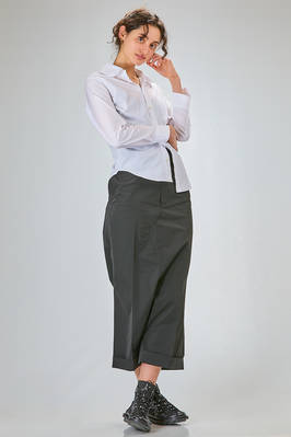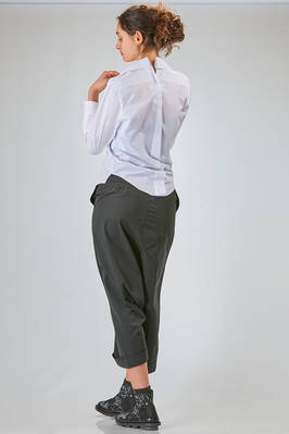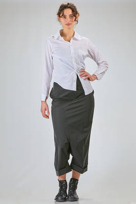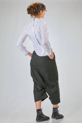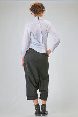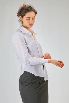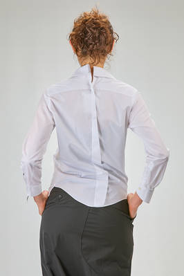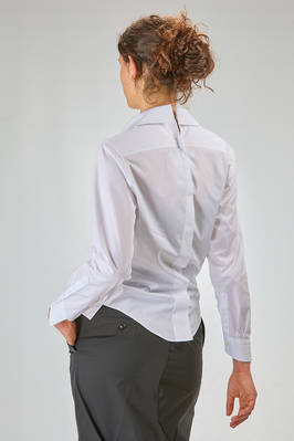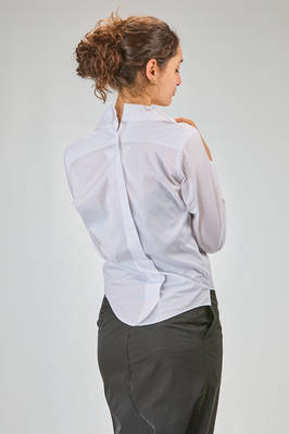 camicia 'sculpture' corta, asciutta e asimmetrica in popeline di cotone, colletto stondato e tagliato al centro sul retro, chiusura con bottoni diagonali, un taschino al petto, costruzione a spirale, pannellino verticale diagonale sul retro. La modella è alta cm. 180 e indossa la taglia L