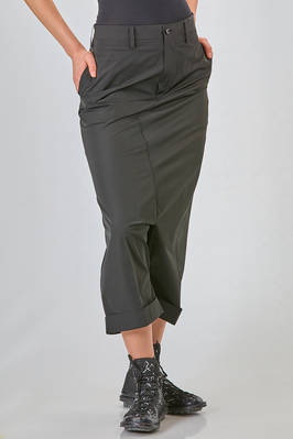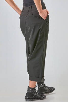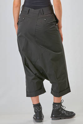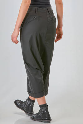 liestere, pantalone ampio, cavallo molto sceso, in twill leggero di poliestere, passanti per cintura, chiusura con zip e bottone, tasche a filo diagonali ai lati, due tasche a filo orizzontale con bottoncino sul retro, con cavallo smontato, piega cucita al fondo. La modella è alta cm. 180 e indossa la taglia M