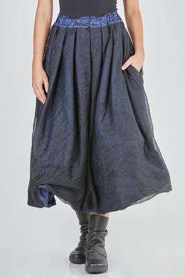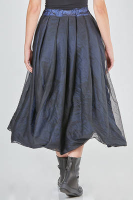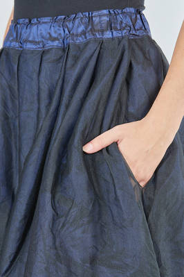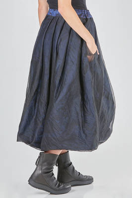 gonna longuette, ampia, doppiata tono su tono: un lato in taffetas di seta lavato e un lato in tulle di seta lavato, elastico in cintura, pieghe cucite diagonali, tasche a filo verticali ai lati, reversibile. La modella è alta cm. 168 e indossa la taglia I