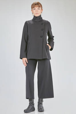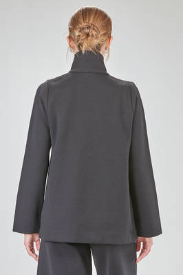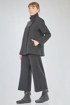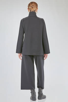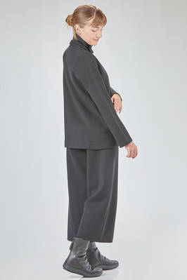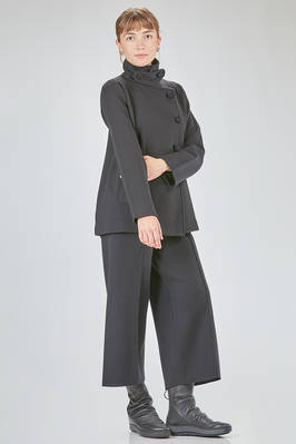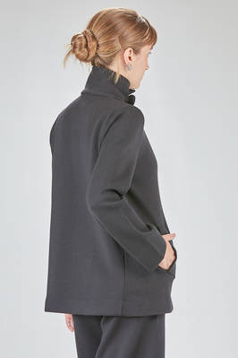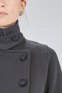 giacca al fianco, lievemente svasata, in maglia lavorata a tessuto di lana merino, doppio petto con collo alto a camicia, chiusura diagonale con bottoni in velluto, pattina removibile al collo, tasche a filo diagonali sul davanti. La modella è alta cm 168 e indossa la taglia I