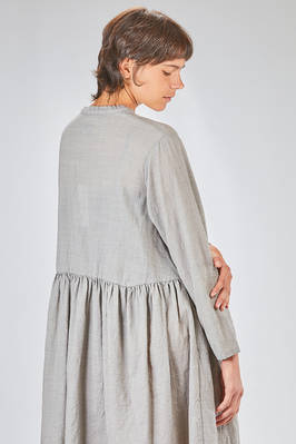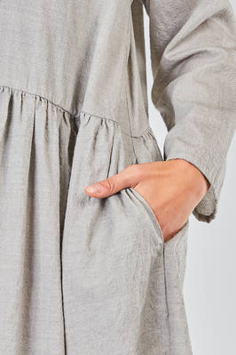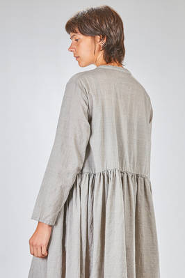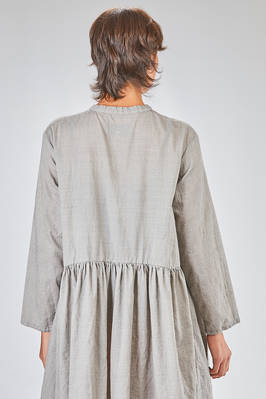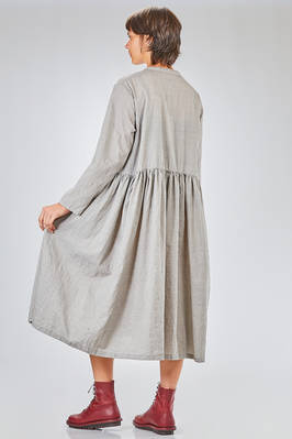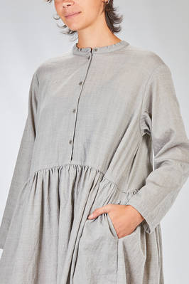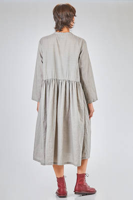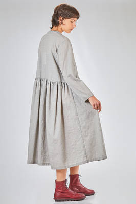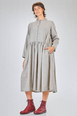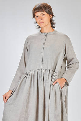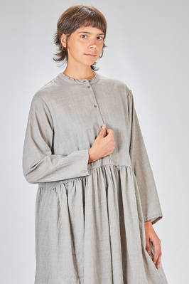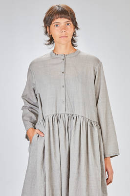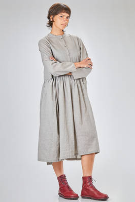 abito longuette, ampio, in crêpe di lana e poliammide, girocollo con bottoncini fino in cintura, manica lunga, tagliato e lievemente arricciato nel giro-vita, tasche a filo verticali ai lati. La modella è alta cm 178 e indossa la taglia I