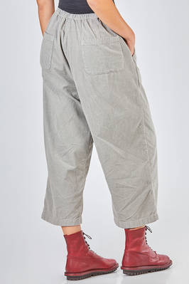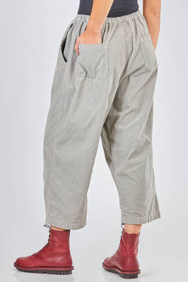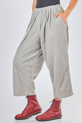 pantalone ampio, in velluto a coste verticali di cotone lavato, elastico in cintura e lieve arricciatura, tasche a filo verticali ai lati, due tasche applicate sul retro. La modella è alta cm 178 e indossa la taglia II