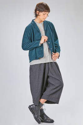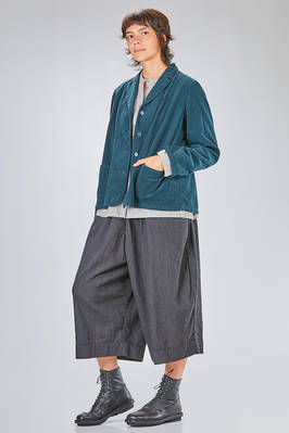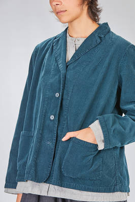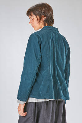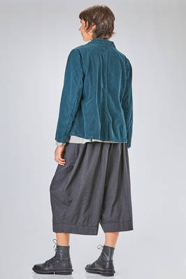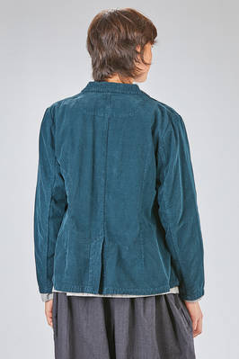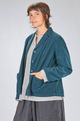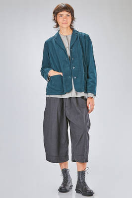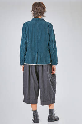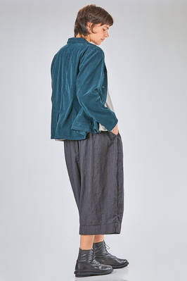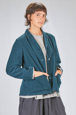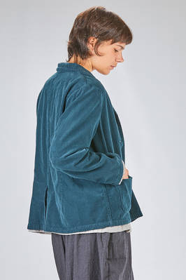giacca al fianco, ampia, in velluto a coste verticali di cotone lavato, un petto con piccoli rever, chiusura con bottoni, due taschini applicati al fondo. La modella è alta cm. 178 e indossa la taglia I