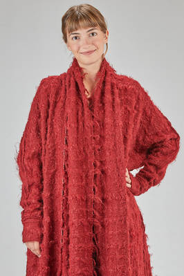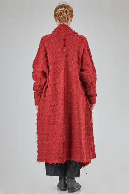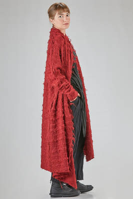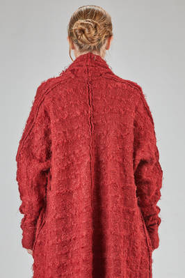 cardigan lungo e ampio a cappotto, in maglia bouclé con parti sfrangettate di yak, mohair e poliammide, ampio collo sciallato con spilla da balia, maniche molto lunghe con asola al fondo, tasche a filo verticali ai lati, fondo asimmetrico più lungo da un lato. La modella è alta cm. 167 e indossa una taglia francese 34 – da considerare come taglia unica