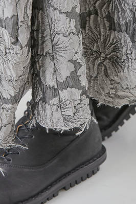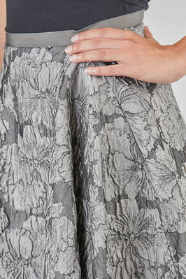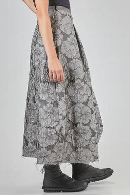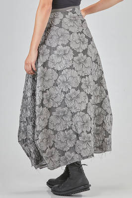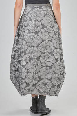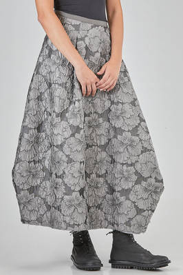 gonna lunga, ampia e asimmetrica in jacquard ad anemoni di fibra polietilinica, poliammide e acrilico, foderata in seta, gros-grain in cintura, chiusura laterale con zip e gancetto, linea a tulipano con pieghe a balze verticali asimmetriche, fondo a taglio vivo. La modella è alta cm. 167 e indossa una taglia francese 36