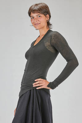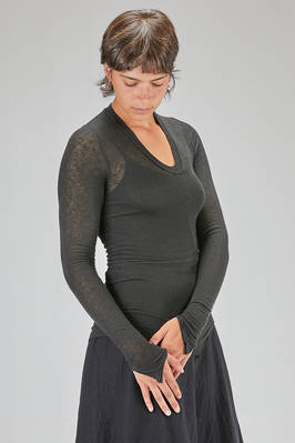 t-shirt al fianco, asciutta, in jersey di viscosa, lana ed elastan con profili a taglio vivo, ampio scollo ellittico ripassato, manica lunga con punta al fondo, fondo stondato. La modella è alta cm. 178 e indossa una taglia 38 francese