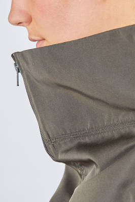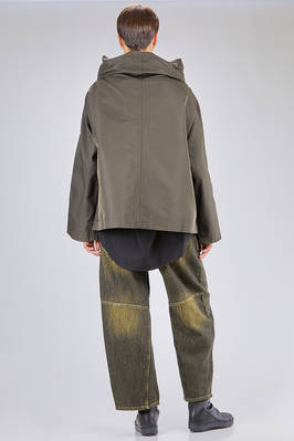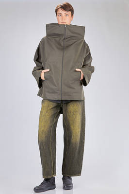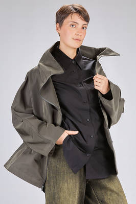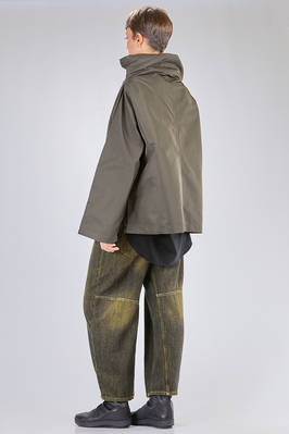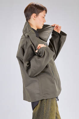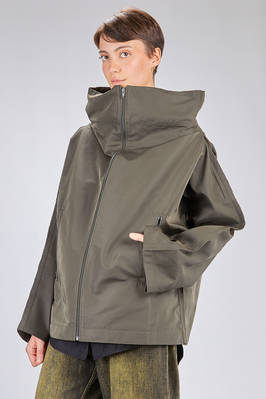 giacca/caban al fianco, linea over, in taffetas pesante di nylon, un petto, alto collo a cratere, chiusura con zip, due tasche a filo verticali con zip sul davanti. La modella è alta cm 180 e indossa la taglia M