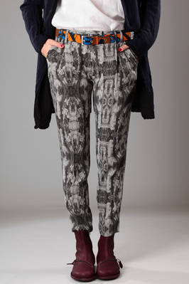 pantalone con pinces in tela di seta stampata con righe sottili multidirezionali, elastico posteriore in cintura, due tasche diagonali, passanti per cintura, chiusura con zip e bottoni, linea morbida