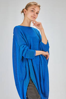tunica lunga, ampia e asimmetrica in maglia di cotone, lino e carta tessile, ampio girocollo, manica lunga scesa, fondo stondato più lungo da un lato, cuciture esterne, spacco laterale sul davanti. La modella è alta cm 175 e indossa la taglia S