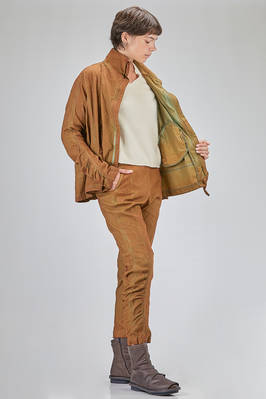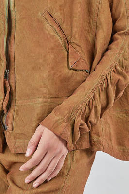 giacca/camicia al fianco, lievemente svasata, in denim sovratinto di cotone, canapa ed elastan, un petto, collo alto, chiusura con zip con doppio cursore, fondo manica con lieve arricciatura, tasche a filo diagonali sul davanti con piccola pattina a triangolo e bottoncino. La modella è alta cm. 178 e indossa la taglia S