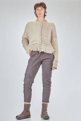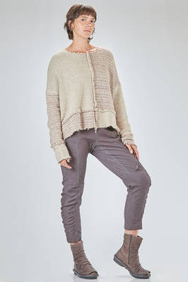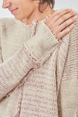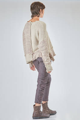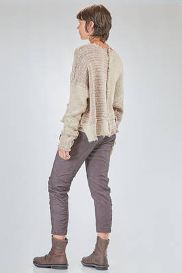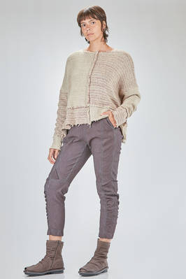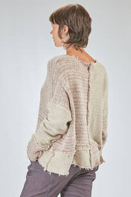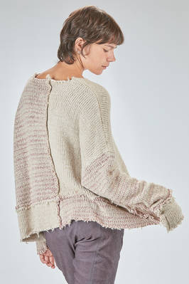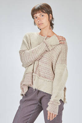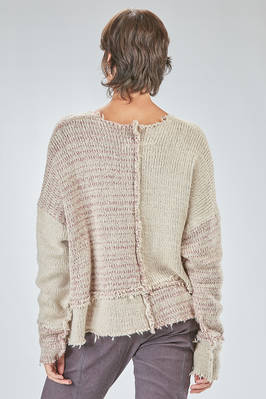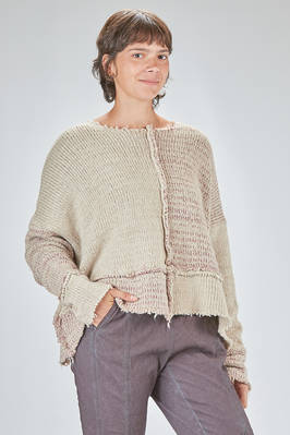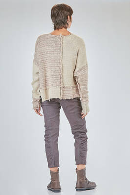 maglia al fianco, ampia, in maglia melange di seta e lana lavorata a blocchi quadrati di diverse dimensioni con cuciture esterne e sfilacciate lungo i bordi, ampio girocollo, manica lunga scesa. La modella è alta cm. 178 e indossa la taglia S