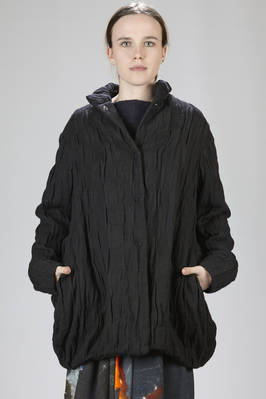 cappotto al ginocchio in tela di lana goffrata, un petto, collo a camicia, chiusura con bottoni a pressione, due tasche a filo verticali ai lati, cuciture posteriori con riprese ad effetto tasca, foderato